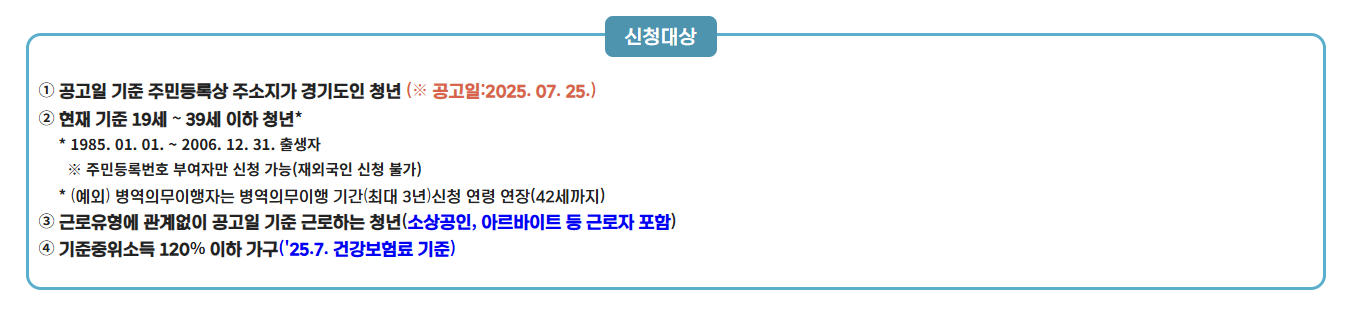 | 지원 대상 | 만 18~34세 경기도 거주 청년, 중위소득 100% 이하, 근로·사업 중 |