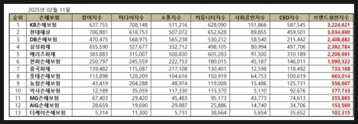 다만, 현대해상과 DB손해보험의 자리가 바껴있구요.