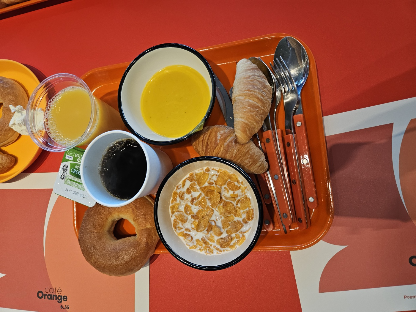 뷔페식으로 나오는 것은 시리얼, 음료 ,커피, 빵, 죽 종류 이구요, 1인당 아메리칸 조식이 하나씩 제공된답니다.