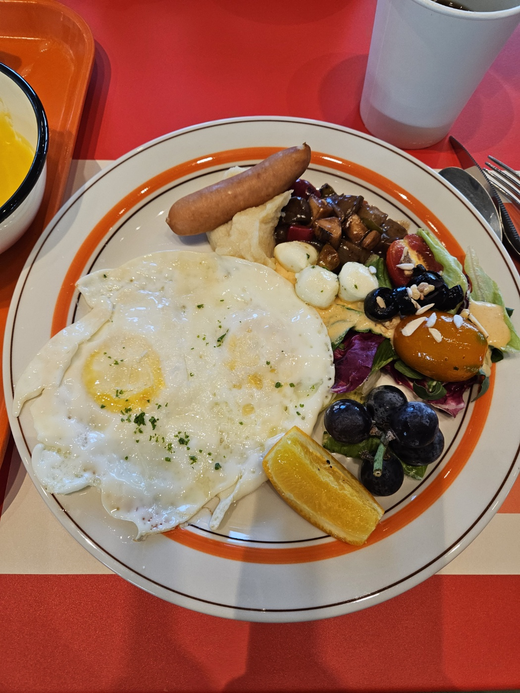 오른쪽처럼 소시지, 계란 프라이, 과일, 샐러드를 담아서 직원분들이 서빙해주십니다.