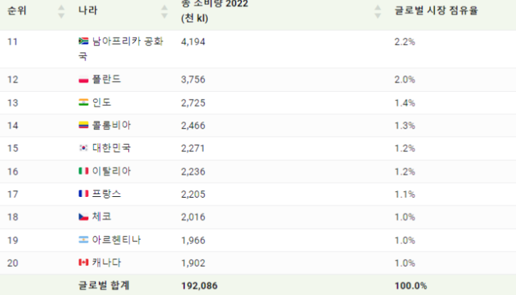 전 세계 소비량 중 1.2%의 비중을 차지하고 있고,
