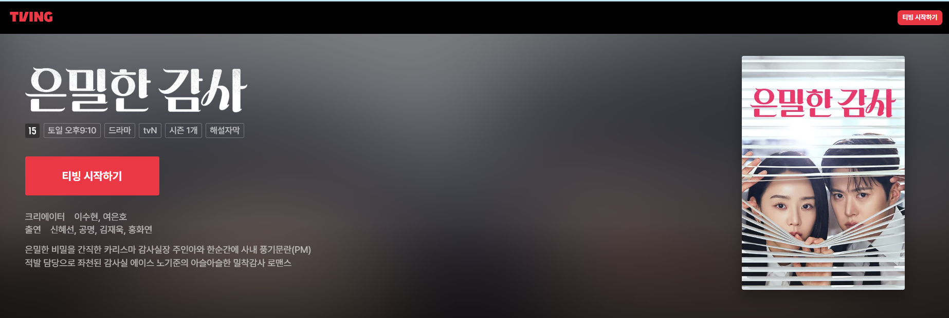 오늘은 2026년 tvN 상반기를 대표하는 드라마 중 하나인 은밀한 감사 기본정보를 깔끔하게 정리해 드리려고 합니다.