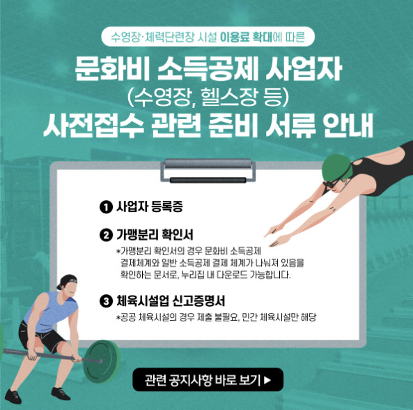 문화체육관광부는 문화비 소득공제 대상을 헬스장·수영장으로 확대해 총급여 7000만 원 이하인 근로소득자는 시설이용료의 30%를 최대 300만 원 한도에서 소득공제로 돌려받을 수 있 - 정책브리