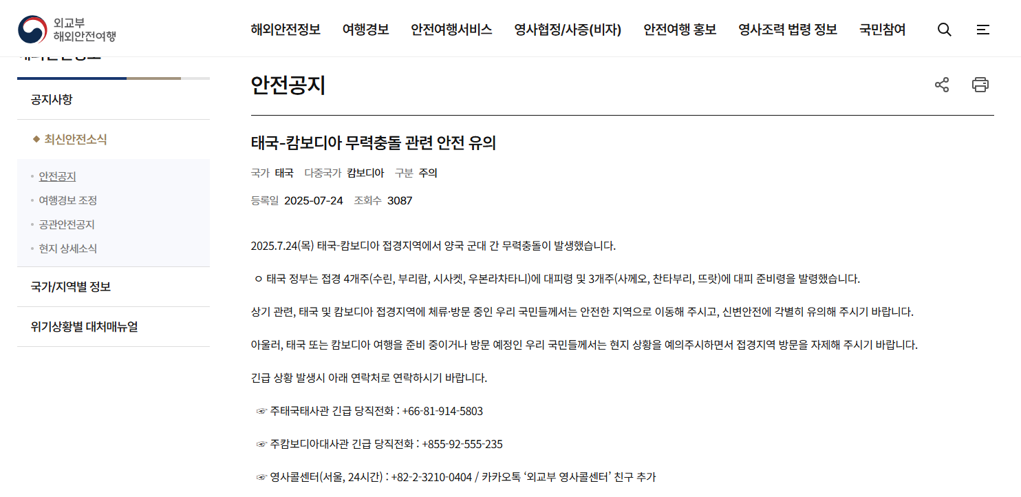 한국 외교부는 2025년 7월 25일자로 태국-캄보디아 접경지역 일부에 대해