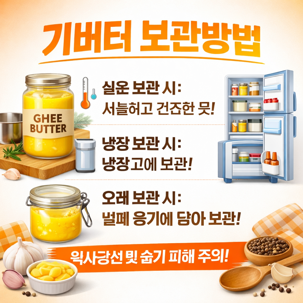 일반 버터는 냉장고에서 보관해야 하고 가열 시 쉽게 타는 반면, 기버터는 높은 발연점 덕분에 튀김, 볶음 요리에 이상적이며 상온 보관도 가능해 실용성이 뛰어나답니다.