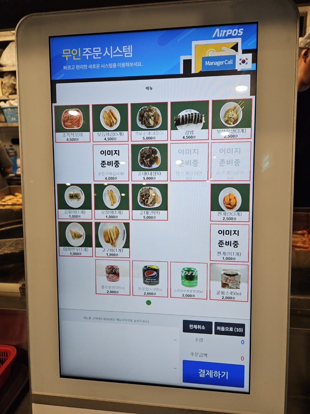 떡볶이는 1인분에 4,500원이구요. 튀김, 김밥도 다 4,500원입니다.