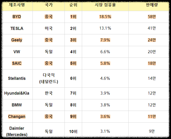 중국의 BYD 에서 테슬라의 판매량을 초월했죠.