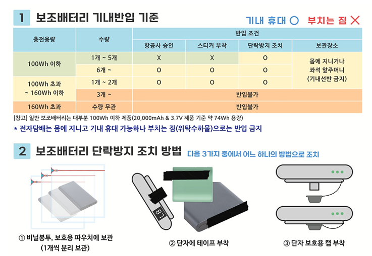 | 용량 표기 | 표기 권장 | Wh 또는 mAh 표기 필수 (표기 없으면 반입 제한) |