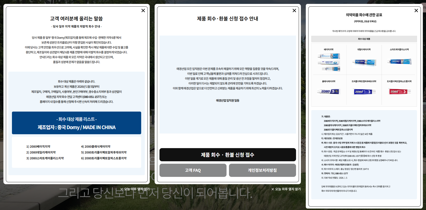 - 첫 화면에서 '2080 치약 회수·환불 안내' 팝업창 확인